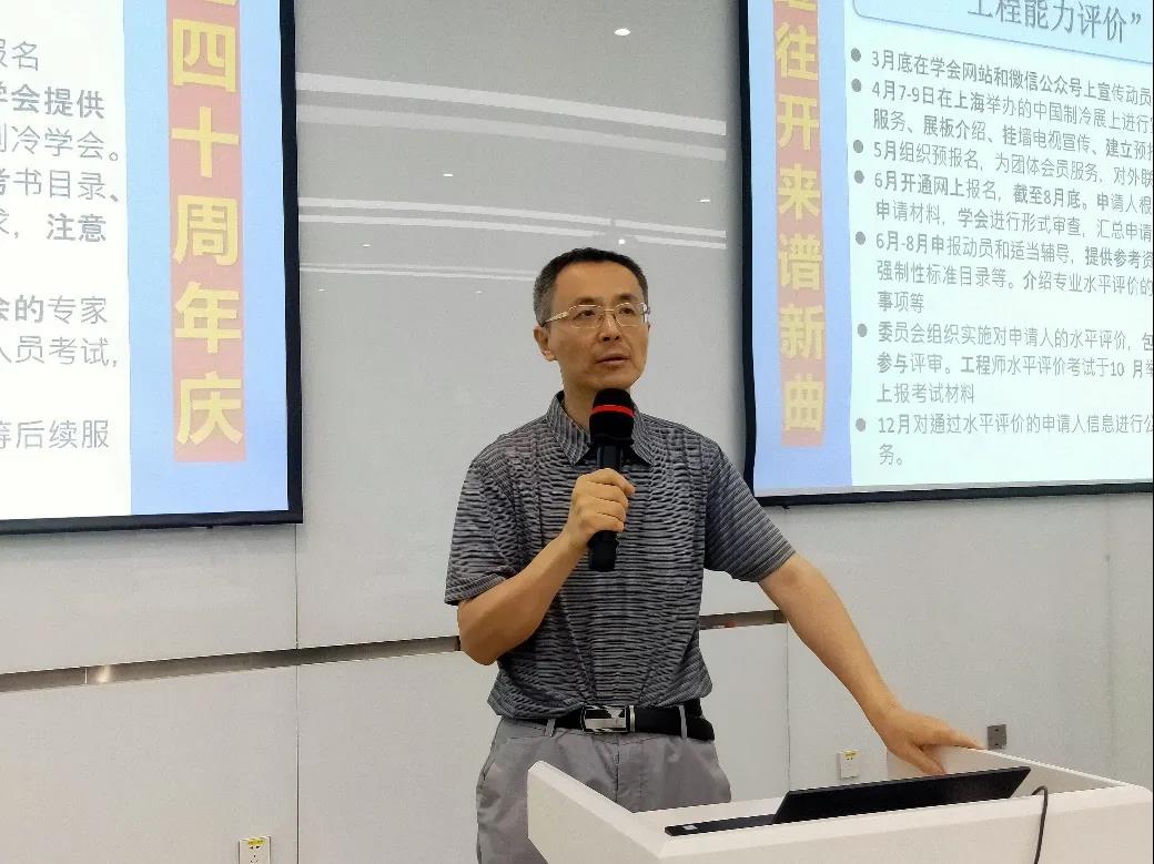 上海市制冷学会办公室主任贾晶高工介绍了“2021年中国制冷学会工程能力评价”申报通知和申报指南,包括报名注意事项、实施条例、申请细则、工程师考试大纲等内容,并介绍本学会“工程能力评价”申报进度计划,请参会者通知相关人员积极报名,为7月16日组织的专家宣讲活动积累人气,吸引更多人申报,提高申报合格率。