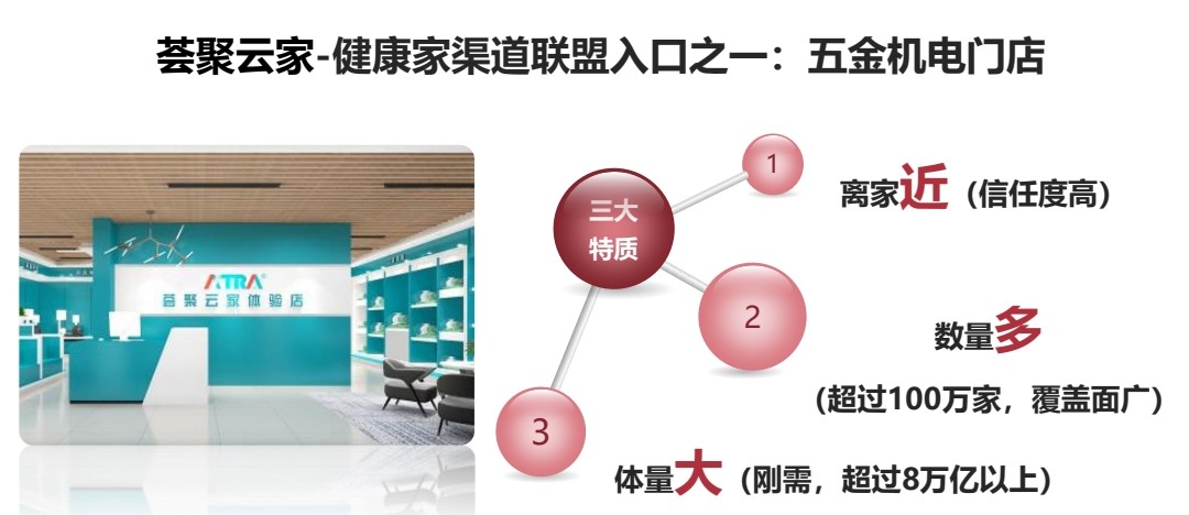 安得利荟聚云家从消费者的实际需求出发,结合目前的消费市场,以水健康为切入点,以线下多家五金门店为入口,对标名创优品,通过改造街边五金店,开展平台的水健康互联网。作为荟聚云家—健康家渠道联盟入口之一的五金机电门店,它有三个主要特点:离家近(信任度高),数量多(超过100万加覆盖面广),体量大(家庭刚需超过80,000亿以上)。可以想象通过线下的这些五金门店联通的水健康服务平台将会惠及全国几千城市,几亿人口。
